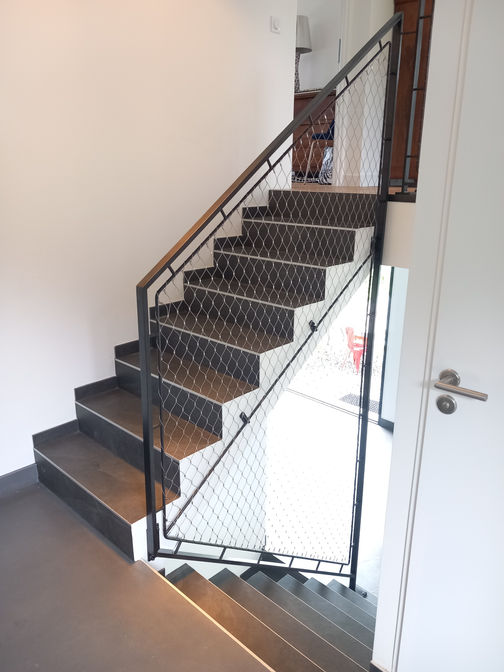 Oamma rampe d'escalier F1 est caractérisé par sont remplissage en filet inox lui donnant une transparence unique et sans entretien.